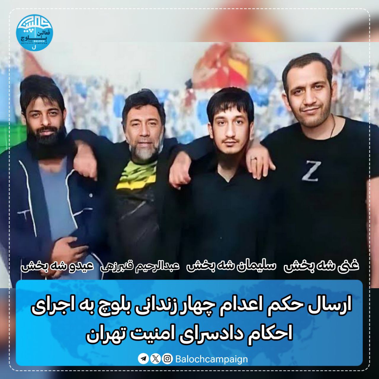به گزارش کمپین فعالین بلوچ، حکم اعدام چهار زندانی بلوچ اهل سنت محبوس در زندان قزلحصار کرج، در حالی به شعبه یکم اجرای احکام دادسرای امنیت تهران ارجاع داده شده که ابهاماتی در رابطه با رعایت حقوق اولیه متهمان و عدم شفافیت در روند دادرسی آنها وجود دارد.