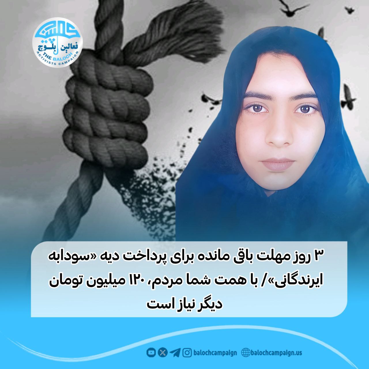 کمپین فعالین بلوچ| خانم سودابه ایرندگانی ۳۴ ساله، متاهل و دارای ۶ فرزند به اتهام قتل در زندان ایرانشهر نگهداری می شود که از سوی دادگاه کیفری به اعدام محکوم و در خطر اعدام قریب الوقوع قرار دارد. خانم ایرندگانی با یک خانم دیگر درگیری لفظی پیدا کرده که فرزند آن خانم توسط شخصی دیگر که کودک است به قتل رسیده و خانم ایرندگانی جهت حفظ جان آن کودک، اتهام قتل را به گردن گرفته و هم اکنون در خطر اعدام است. خانم ایرندگانی در ششم آبان ماه ۱۴۰۱ توسط نیروهای نظامی به اتهام قتل بازداشت شده است. خانواده مقتول درخواست دو میلیارد تومان دیه کرده که با همت شما مردم کل مبلغ آماده شده و تنها ۱۲۰ میلیون تومان کسری دارد و تا تاریخ ۸ آبان ماه فرصت داده شده تا باقی مانده دیه را پرداخت کنند و در غیر اینصورت حکم وی به اجرا درخواهد آمد. خانم سودابه ایرندگانی از خانواده ای فقیر و کم بضاعت است که توان پرداخت دیه را ندارند و بسیاری از اعضای خانواده و نزدیکان او نیز توسط نیروهای نظامی جمهوری اسلامی کشته، زخمی و یا در بازداشت بسر میبرند.