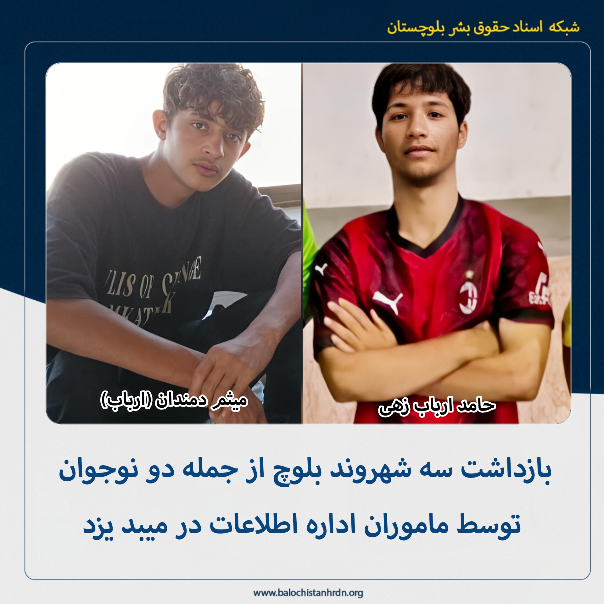 به گزارش شبکه اسناد حقوق بشر بلوچستان (کمپین فعالین بلوچ)، روز سه شنبه ۳۰ دی ماه ۱۴۰۴، سه شهروند بلوچ از جمله دو نوجوان در میبد یزد بازداشت شدند.