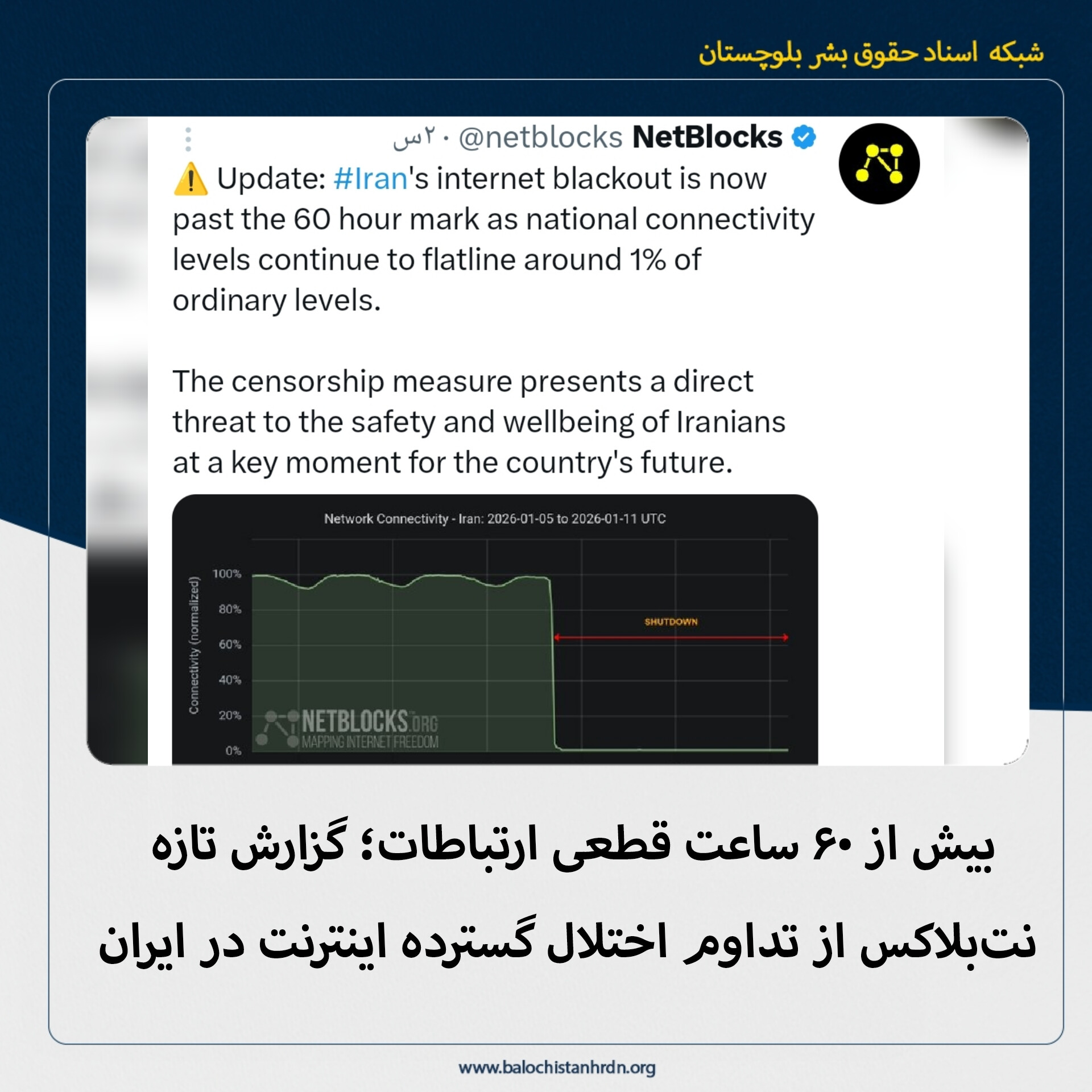 امروز یکشنبه ۲۱ دی ماه ۱۴۰۴، بر اساس گزارش تازه منتشرشده از سوی نهاد پایش اینترنت «نت‌بلاکس»، قطع و اختلال گسترده اینترنت در ایران وارد بیش از ۶۰ ساعت شده و سطح اتصال سراسری کشور همچنان در حدود یک درصد از میزان عادی گزارش شده است.