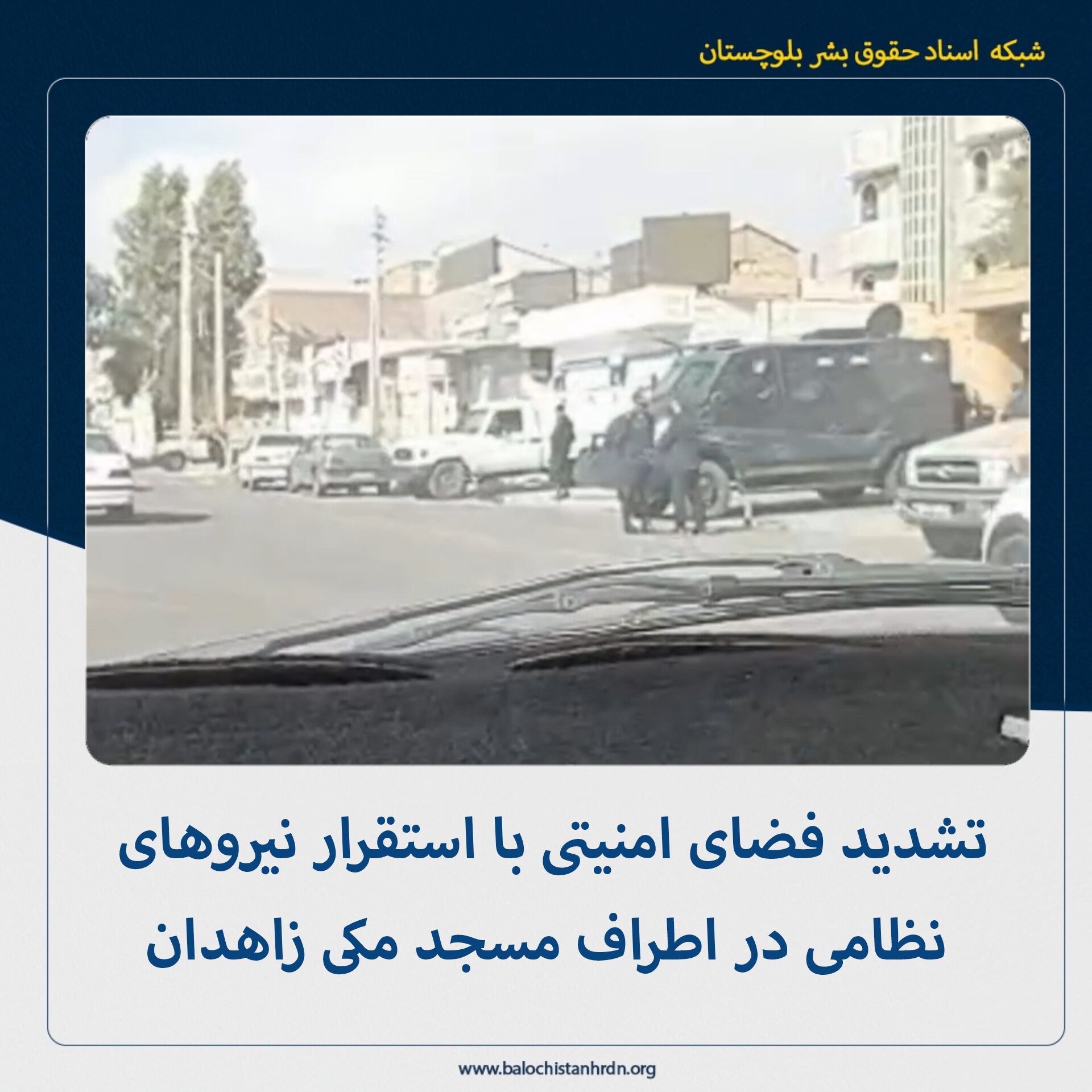 به گزارش شبکه اسناد حقوق بشر بلوچستان (کمپین فعالین بلوچ)، امروز جمعه ۲۶ دی ماه ۱۴۰۴، نیروهای نظامی و امنیتی با استقرار در اطراف مسجد مکی زاهدان و خیابان های منتهی به آن، فضای امنیتی حاکم کردند.