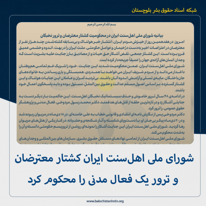 به گزارش شبکه اسناد حقوق بشر بلوچستان (کمپین فعالین بلوچ)، شورای ملی اهل‌سنت ایران با انتشار بیانیه‌ای، ضمن ابراز نگرانی عمیق از تداوم سرکوب اعتراضات مردمی، گزارش‌ها درباره کشته‌شدن شمار زیادی از معترضان در جریان اعتراضات اخیر را نقض آشکار حق حیات دانست و آن را به‌شدت محکوم کرد.