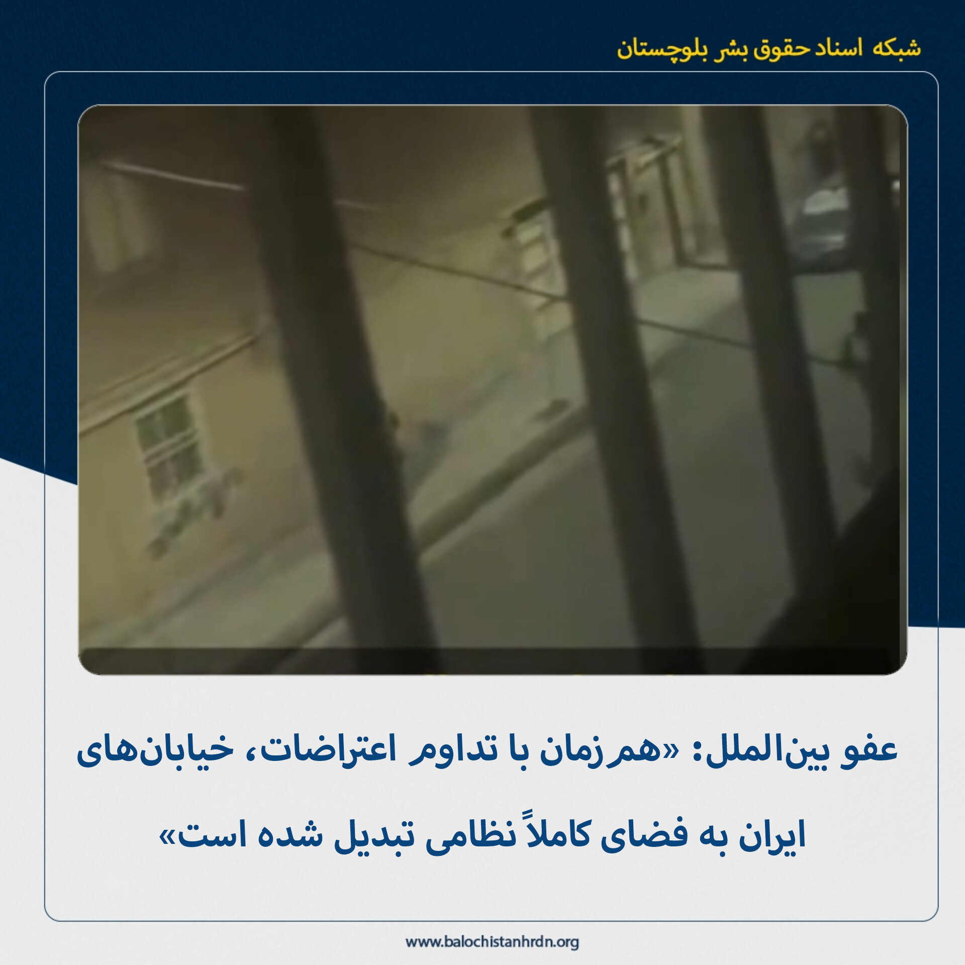 به گزارش شبکه اسناد حقوق بشر بلوچستان (کمپین فعالین بلوچ)، روز جمعه ۲۶ دی‌ماه ۱۴۰۴، سازمان عفو بین‌الملل اعلام کرد که در پی ادامه اعتراضات مردمی در شهرهای مختلف ایران و هم‌زمان با قطع سراسری اینترنت از هشتم ژانویه، فضای عمومی کشور به‌طور بی‌سابقه‌ای امنیتی و نظامی شده است.