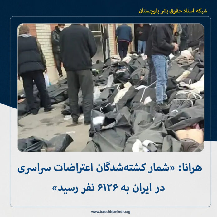 به گزارش شبکه اسناد حقوق بشر بلوچستان (کمپین فعالین بلوچ)،.بر اساس تازهترین دادههای تجمیعی خبرگزاری هرانا، ارگان خبری مجموعه فعالان حقوق بشر در ایران، در سیامین روز اعتراضات سراسری، شمار کشتهشدگان تأییدشده به ۶۱۲۶ نفر افزایش یافته است.
