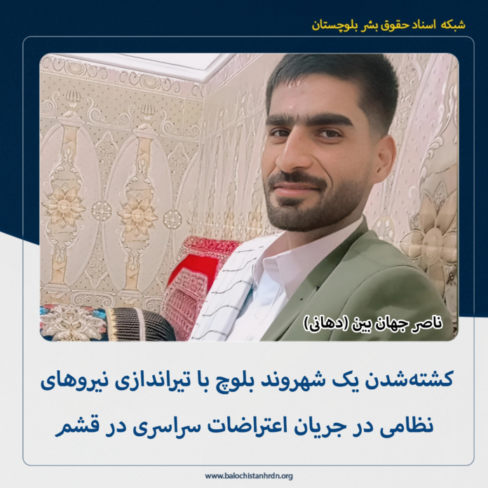 به گزارش شبکه اسناد حقوق بشر بلوچستان (کمپین فعالین بلوچ)، شامگاه پنج‌شنبه ۱۸ دی‌ماه ۱۴۰۴، یک شهروند بلوچ در جریان اعتراضات سراسری در جزیره قشم استان هرمزگان مورد هدف تیراندازی نیروهای نظامی قرار گرفت و کشته شد.