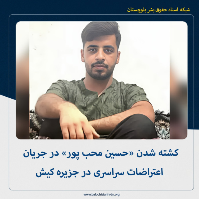 یک شهروند بلوچ در جریان اعتراضات سراسری در جزیره کیش، مورد هدف تیراندازی نیروهای نظامی از ناحیه سینه قرار گرفت و کشته شد.