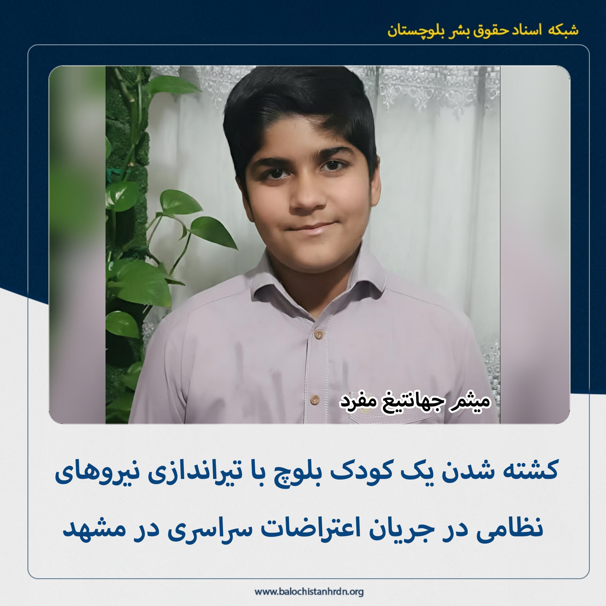 به گزارش شبکه اسناد حقوق بشر بلوچستان (کمپین فعالین بلوچ)، شامگاه جمعه ۱۹ دی ماه ۱۴۰۴، یک کودک بلوچ با تیراندازی نیروهای نظامی در مشهد کشته شد.