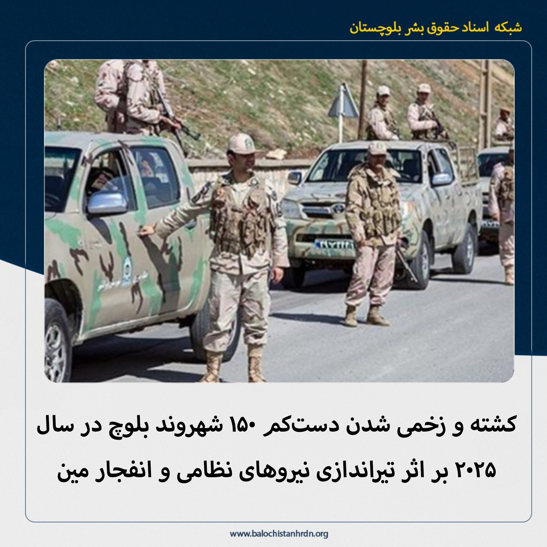 به گزارش شبکه اسناد حقوق بشر بلوچستان (کمپین فعالین بلوچ)، در طول سال ۲۰۲۵ میلادی دستکم ۸۹ شهروند بلوچ در مناطق مختلف بلوچستان بر اثر تیراندازی نیروهای نظامی جمهوری اسلامی جان خود را از دست دادهاند و ۶۱ شهروند دیگر نیز در نتیجه این تیراندازیها مجروح شدهاند.