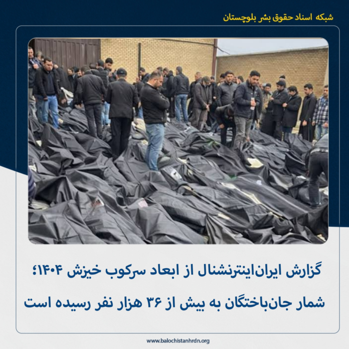 به گزارش شبکه اسناد حقوق بشر بلوچستان (کمپین فعالین بلوچ)، امروز یکشنبه پنجم بهمن‌ماه ۱۴۰۴، شورای سردبیری ایران‌اینترنشنال در گزارشی تفصیلی اعلام کرد که بر اساس اسناد محرمانه، گزارش‌های میدانی، روایت‌های کادر درمان و شهادت شاهدان عینی، ابعاد خشونت نیروهای امنیتی جمهوری اسلامی در جریان خیزش ۱۴۰۴، به‌ویژه وقایع خونین دی‌ماه، به‌مراتب گسترده‌تر از برآوردهای اولیه بوده و شمار جان‌باختگان این سرکوب هدفمند به بیش از ۳۶ هزار و ۵۰۰ نفر رسیده است.