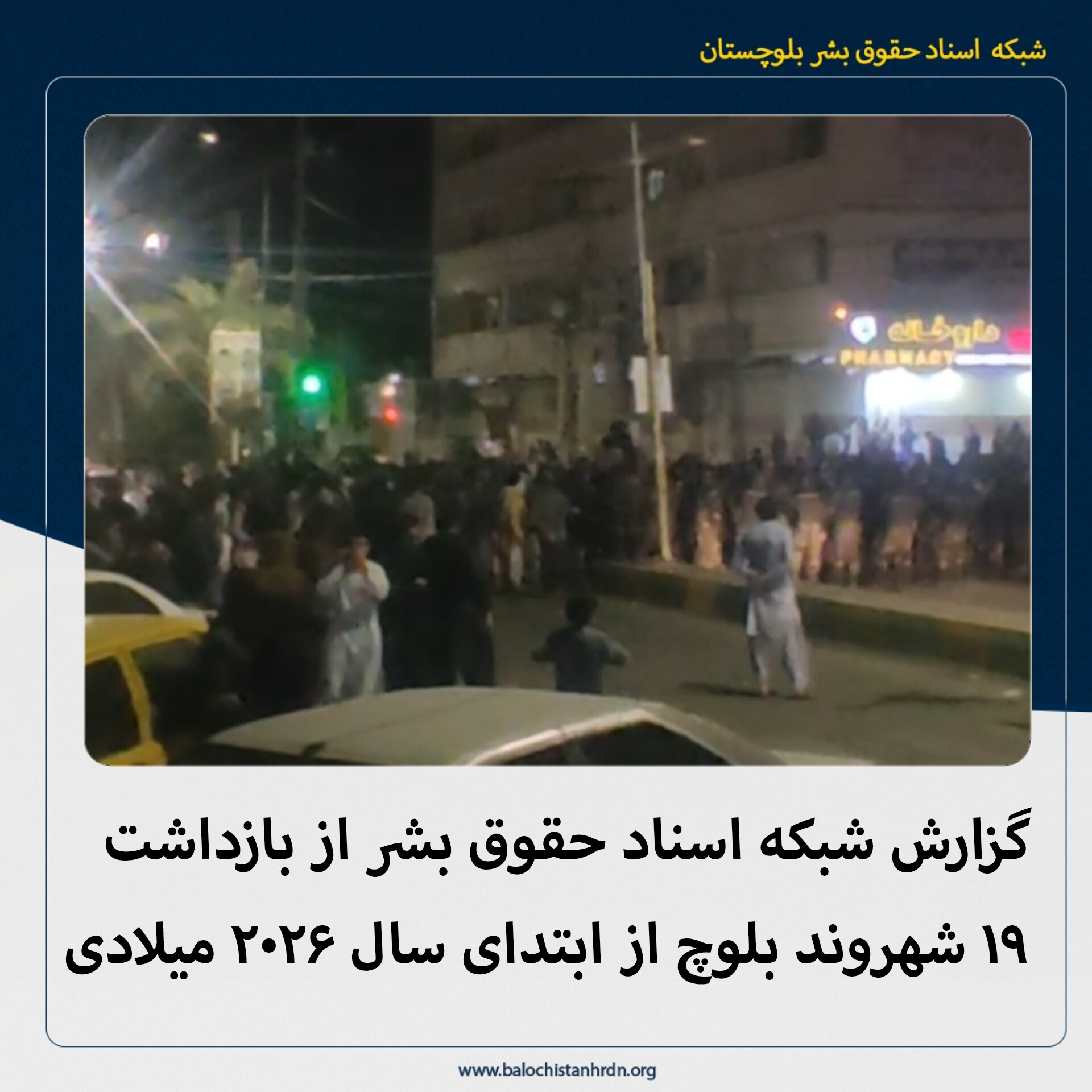 از ابتدای سال ۲۰۲۶ میلادی، مصادف با پنجشنبه ۱۱ دیماه ۱۴۰۴، دستکم ۱۹ شهروند بلوچ از مناطق مختلف ایران توسط نیروهای نظامی و امنیتی جمهوری اسلامی بازداشت شدهاند.