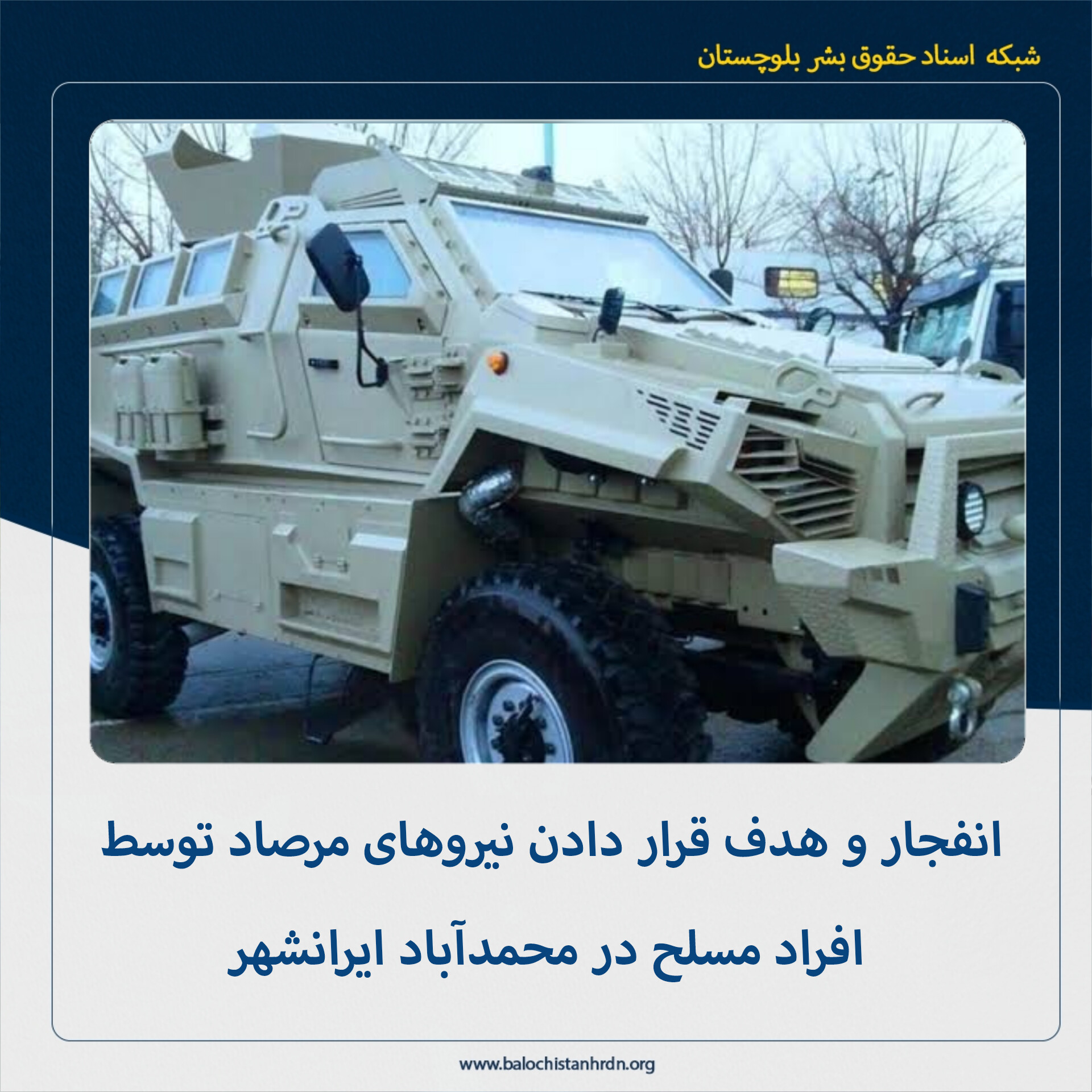 شبکه اسناد حقوق بشر بلوچستان (کمپین فعالین بلوچ) امروز چهارشنبه ۲۲ بهمن ماه ۱۴۰۴، افراد مسلح در محمدآباد ایرانشهر مقابل بیمارستان ایران، خودروی زرهی نیروهای مرصاد را هدف قرار دادند.