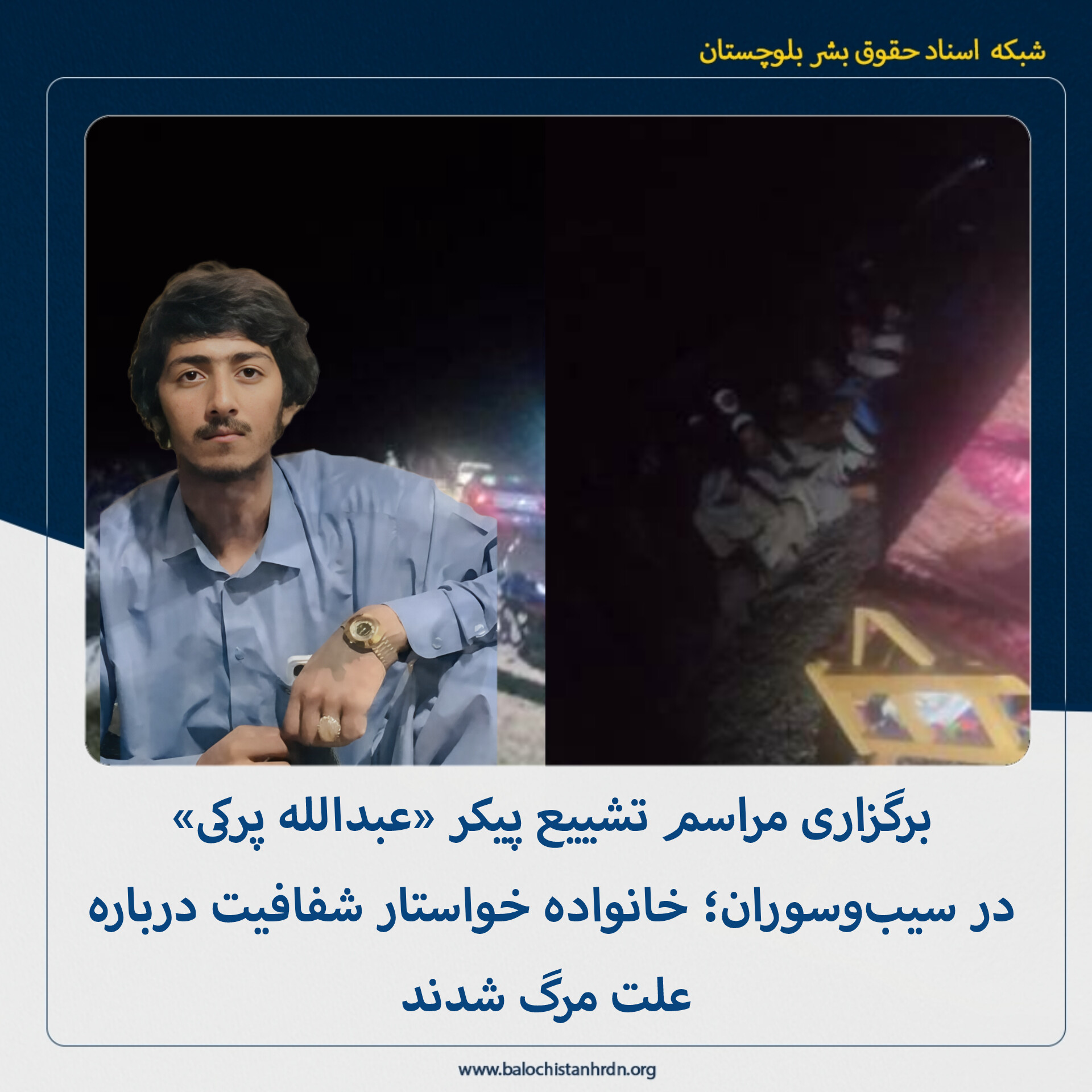 به گزارش شبکه اسناد حقوق بشر بلوچستان – شامگاه یکشنبه سوم اسفند ماه ۱۴۰۴، مراسم تشییع پیکر عبدالله پرکی، شهروند بلوچ ۲۰ ساله اهل روستای کنت از توابع شهرستان سیبوسوران، با حضور گسترده مردم از نقاط مختلف مهرستان برگزار شد.