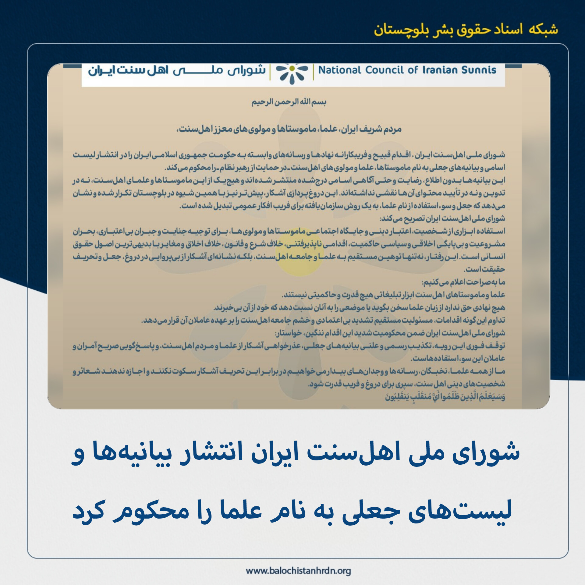 به گزارش شبکه اسناد حقوق بشر بلوچستان (کمپین فعالین بلوچ)، شورای ملی اهل سنت ایران با انتشار بیانیه ای، درج نام علمای اهل سنت در بیانیه حمایتی از علی خامنه ای را محکوم و اعلام کرد که اسامی منتشرشده بدون اطلاع و رضایت افراد درج شده و هیچیک از علما و ماموستاهای اهلسنت نقشی در تدوین یا تأیید این مطالب نداشتهاند.