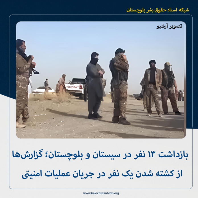 به گزارش شبکه اسناد حقوق بشر بلوچستان، امروز پنج شنبه ۲۸ اسفند ماه ۱۴۰۴، وزارت اطلاعات جمهوری اسلامی با صدور اطلاعیه ای از بازداشت ۱۳ شهروند و کشته شدن یک نفر دیگر در جریان عملیات امنیتی در سیستان و بلوچستان خبر داد.