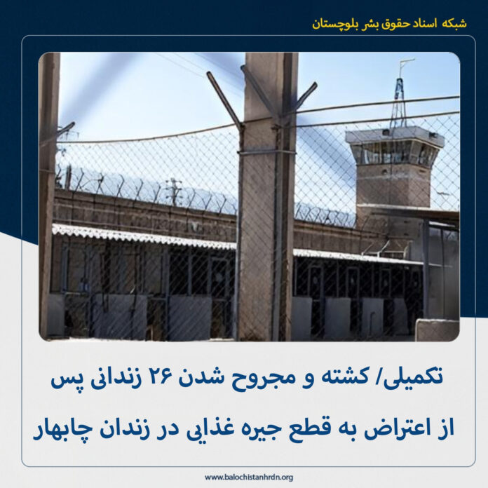 براساس اطلاعات تازه رسیده، دستکم ۲۶ زندانی در زندان چابهار با شلیک مستقیم نیروهای امنیتی پس از اعتراض به قطع جیره غذایی کشته و مجروح شدند.