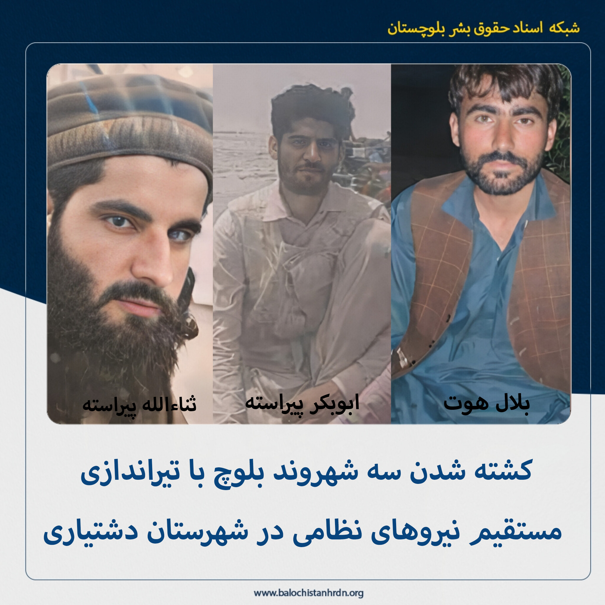 هویت این سه شهروند بلوچ، «بلال هوت» حدودا ۲۴ ساله فرزند موسی اهل شهرک کچ نگور، «ابوبکر پیراسته» ۲۷ ساله و «ثناءالله پیراسته» ۲۹ ساله، هر دو فرزند عبدالله اهل روستای سماچ شهرستان دشتیاری اعلام شده است.